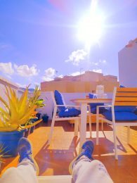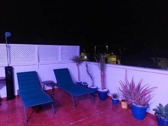 Durante tu estancia dispondrás de una terraza de 45 m2, en ella dispondrás de dos tumbonas, una mesa con sus respectivas sillas para seis comensales, un chill out exterior para relajarse a la luz de la luna y estrellas.