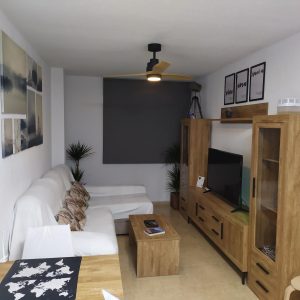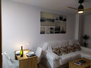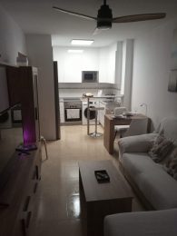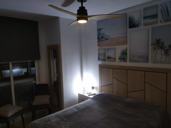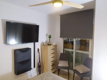 En el salón dispondrás de aire acondicionado, una televisión Smart Tv, un reproductor echo dot, un sofá chaiselongue , un ventilador de techo y un escritorio para poder trabajar desde casa.