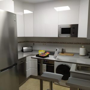 La cocina se encuentra adherida al salón, tiene una barra americana junto a dos taburetes. En ella podrás disponer de un refrigerador combi LG, un microondas Candy, un lavavajillas de 45 cm, horno, placa de inducción, tostadora y una lavadora – secadora Haier.