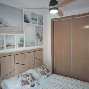 En el dormitorio dispondrás de una televisión de 50 pulgadas, una cama de matrimonio de 150×190, un armario empotrado disponible para dos personas, mesita de noche, espejo vertical y una tabla de planchar,